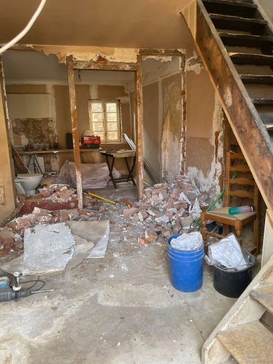 Travaux structurels complexes : démolition partielle, reconstruction selon les normes actuelles, et réfection complète de la charpente.